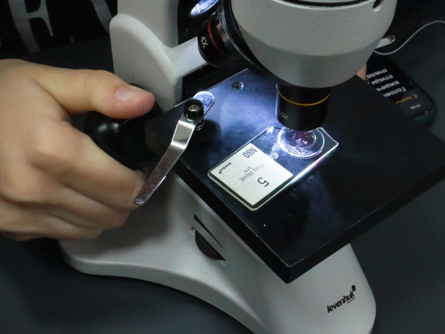 «Наиболее интересен образец крови лягушки. Связано это с тем, что эритроциты лягушки значительно крупнее, чем эритроциты человека. В зрелых клетках человека отсутствуют ядра, тогда как в эритроцитах лягушки они есть. При малом увеличении микроскопа видно большое количество крупных эритроцитов овальной формы с голубыми или темно-синими ядрами. Между эритроцитами заметны округлые лейкоциты. При большом увеличении микроскопа отчетливее видны далеко расположенные друг от друга эритроциты овальной формы с голубым или темно-синим ядром и розоватой цитоплазмой. Форма ядра эритроцитов лягушки повторяет форму клетки. Среди эритроцитов находится небольшое количество более мелких лейкоцитов округлой формы с ядрами подковообразной или округлой формы», — прокомментировала эксперт Марина Минякова.