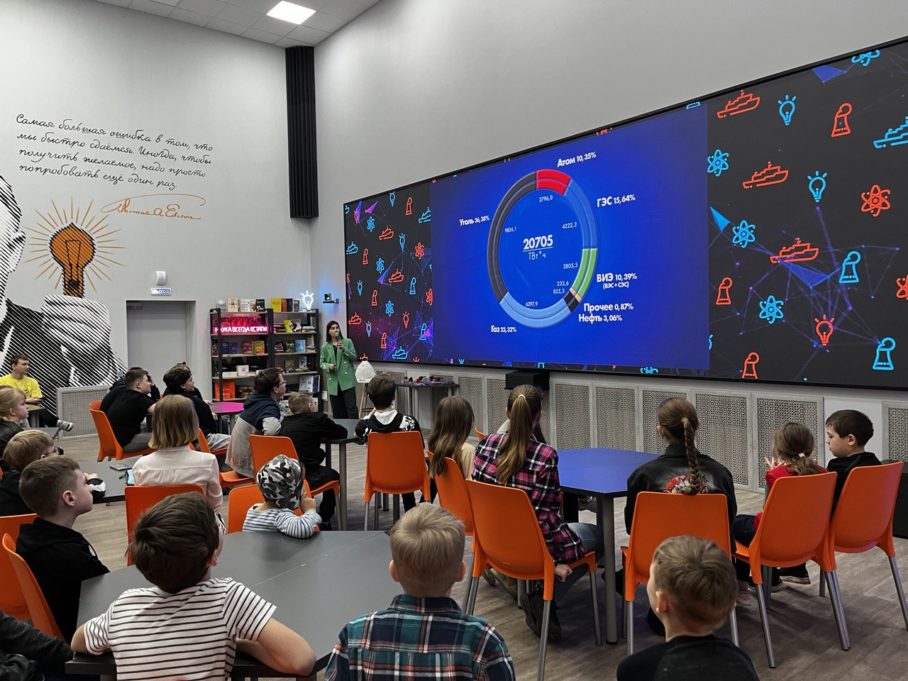 Ребята познакомились с понятием ЕНЭС – все электростанции объединены в единую сеть, и потребитель получает электроэнергию не от конкретной электростанции, которых может быть много и разного вида, а от распределительного центра. Школьники узнали, что атомные и ветряные электростанции – самые экологичные, а теплоэлектростанции вырабатывают наибольшее количество электроэнергии в мире.