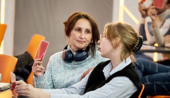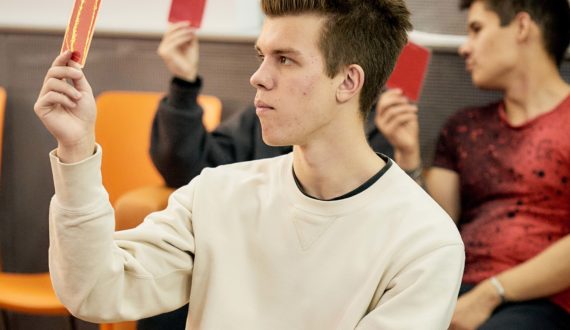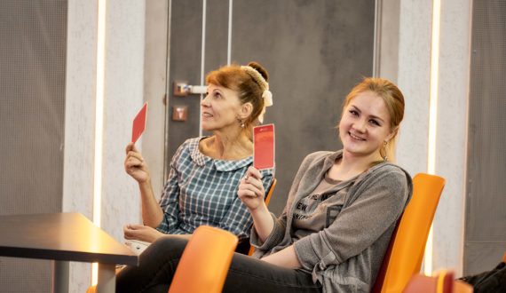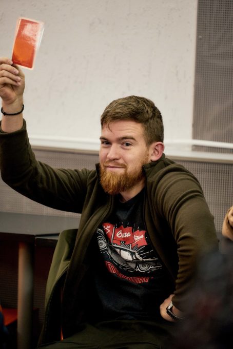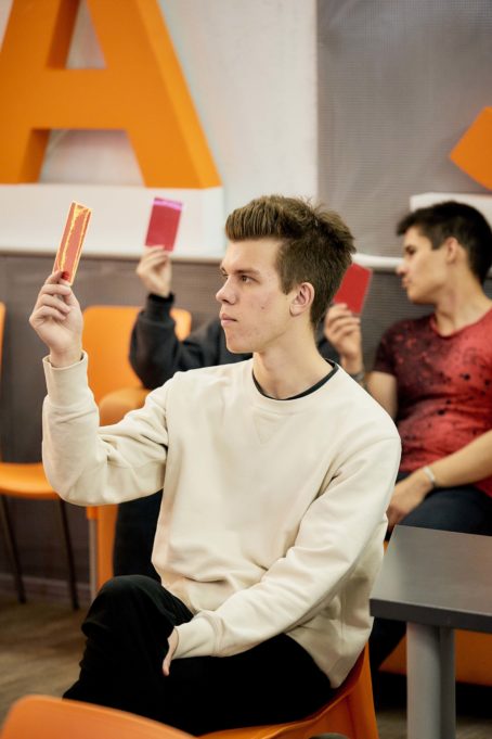 «Ралли-квиз я ждал весь вечер, нужно было отвечать на вопросы с помощью карточек: если поднимаешь зелёную, то ты согласен с утверждением, если красную, то не согласен. Нижний Новгород и Ижевск разделили первое место, ответили правильно на равное количество вопросов. Был азарт, атмосфера стояла потрясающая!», — поделился десятиклассник из Нижнего Новгорода Алексей Покусайкин.