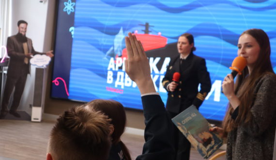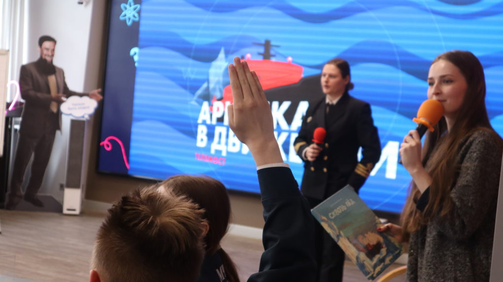 Северный морской путь и ледоколы, Арктика и её обитатели объединили 20 апреля на телемосте «Арктика в движении» Информационные центры по атомной энергии (ИЦАЭ) Мурманска и Санкт-Петербурга. Гостями стали ученики средней общеобразовательной школы №619 Калининского района Санкт-Петербурга и ученики Кадетской школы Мурманска.