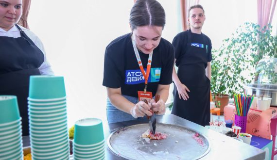 Всех юных посетителей фестиваля ждал праздничный сюрприз – мороженое и сладкая вата, раскрашенные в цвета «АтомДвижа».