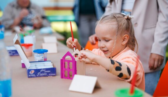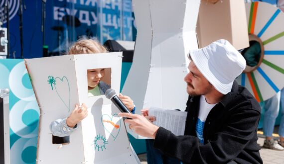 А юные мечтатели в творческой мастерской «Город будущего» под руководством профессиональных художников в течение всего дня раскрашивали деревянные домики в своём стиле, чтобы потом объединить их на макете города и вместе запустить электроэнергию в построенные дома от АЭС будущего.
