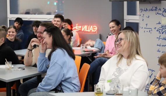 В зале собралась действительно увлечённая аудитория. Александра Потапова приехала с детьми из другого города, и вечер понравился всем: «У нас третьеклассник, он говорил: «Ничего не понятно, но всё интересно». Старший ребёнок занимается в школе и постоянно участвует в олимпиадах математических. Очень легко и интересно, с увлекательной практикой — именно так начинать знакомиться с математикой будет намного интереснее детям».