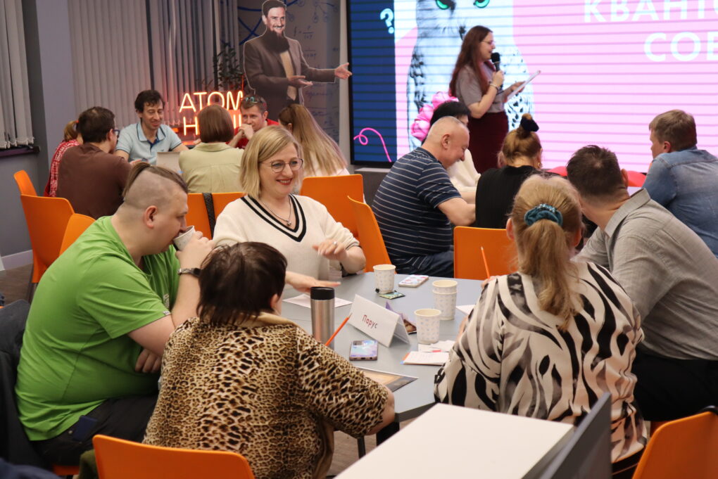Вечер начался с открытия «Научной гостиной». Играя в любимые настолки сети ИЦАЭ гости смогли не только весело провести время, но и вспомнить важные даты из истории науки, угадать определение сложных терминов, а также узнать чуть больше об устройстве АЭС благодаря играм «Чепухатом», «Хронограф» и «Атомное мемори».