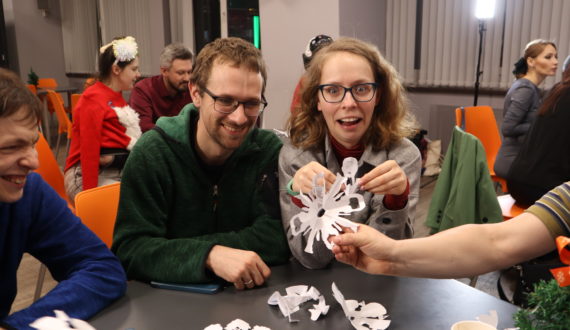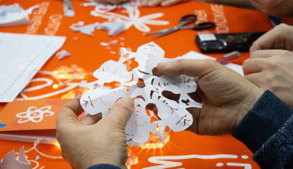 Завершился квест-телемост вырезанием снежинок с изображениями Игоря Курчатова, Марии Кюри, Альберта Эйнштейна и Эрвина Шрёдингера, а его общим итогом стали формулы счастья, которые каждая команда расшифровала самостоятельно.