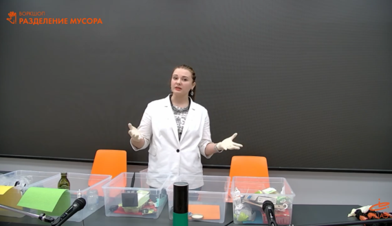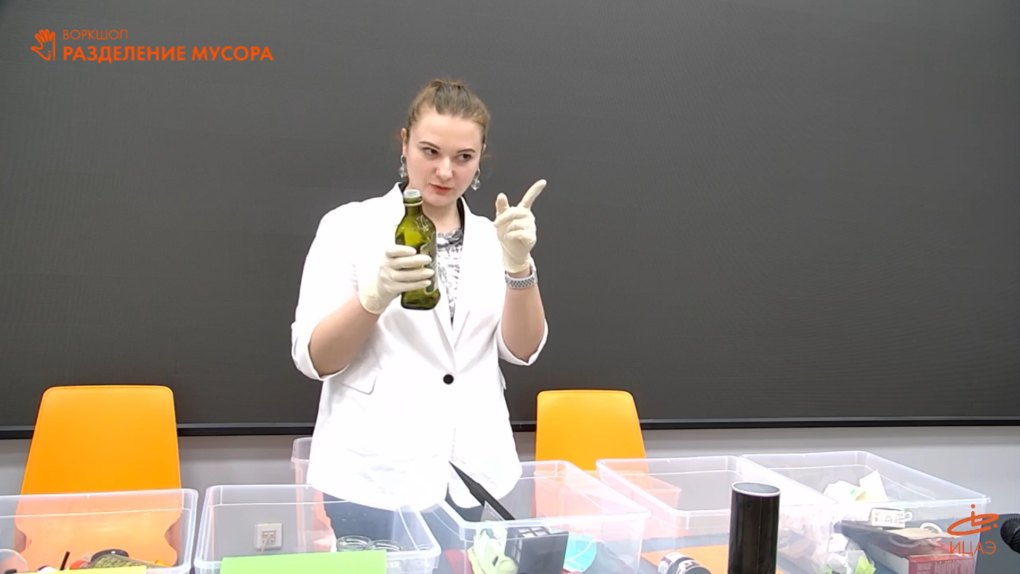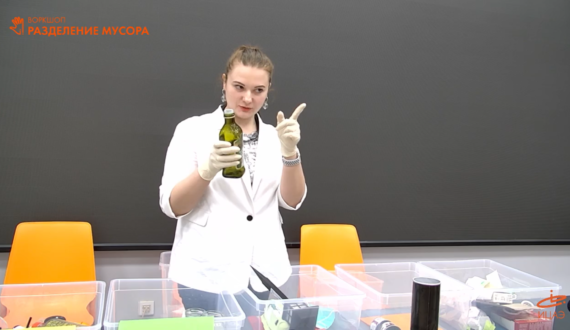 В рамках воркшопа гости ИЦАЭ рассортировали предметы из мусорного контейнера по единой цветовой схеме для разных видов отходов. Так, зелёный контейнер – стекло (бутылки, стаканы); синий – бумага (газеты, журналы и другие печатные издания); жёлтый – картон (пустые картонные упаковки); чёрный – органические остатки (пищевые отходы, компост); коричневый – опасные отходы (батарейки); красный – неперерабатываемые отходы, оранжевый – пластиковые бутылки.