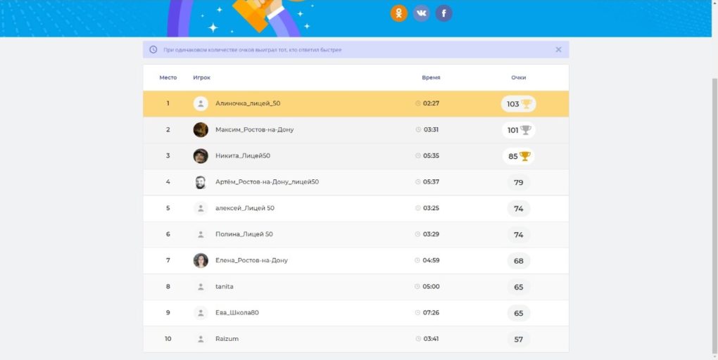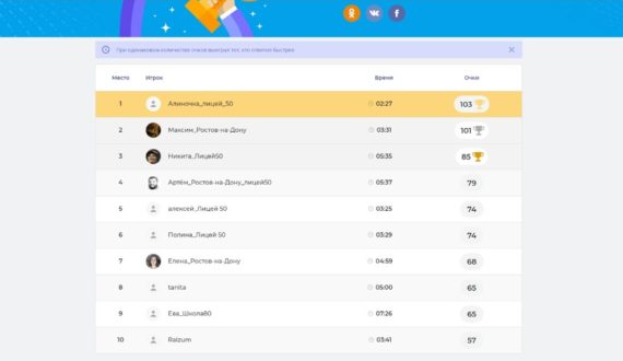 В интеллектуальном состязании приняли участие следующие ростовские школы: МБОУ «Гимназия №25», МБОУ «Лицей №50 при ДГТУ», МАОУ «Школа №53», МБОУ «Школа №80». Победителями стали ученики МБОУ «Лицей №50 при ДГТУ». Они быстрее и правильнее ответили на вопросы викторины.