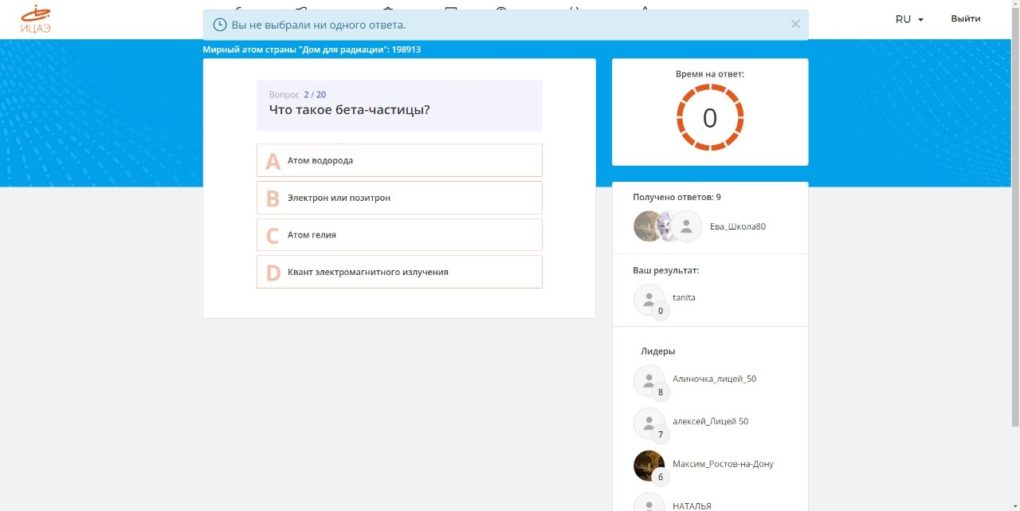 В ходе квиза участники узнали, что радиация появилась с момента образования Земли, ионизирующее излучение можно измерить дозиметром, а разновидность химического элемента с разным числом нейтронов называется изотопом.