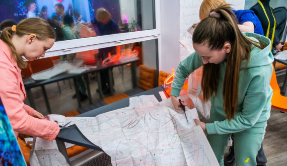 Вдохновившись общением с Ксенией Малиной, зрители телемоста попробовали свои силы в кройке и шитье. Шесть команд из Воронежа и Челябинска соревновались в выкройке деталей на скорость.