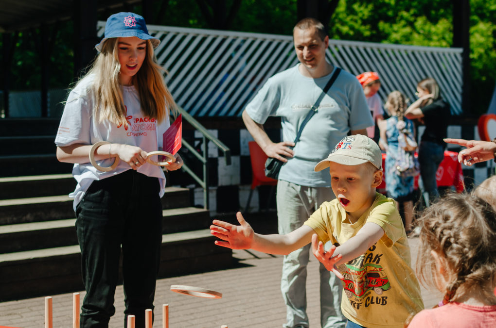 Днем на Набережной Грина действовали уличные активности для горожан. Прогуливающиеся семьи останавливались поиграть в игры, популяризирующие науку. И детям, и взрослым были интересные огромные напольные шашки: в них должны были сразиться позитроны и электроны, а шашка, вышедшая «в дамки», называлась радиоактивным изотопом.