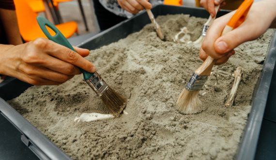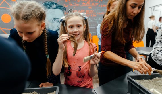 После лекции слушатели примерили на себя роль палеонтологов и откопали в специально устроенном в помещении ИЦАЭ импровизированном раскопе кости. Как догадались некоторые юные участники, они обнаружили скелет древней собаки. Эти кости сохранились с XV века.