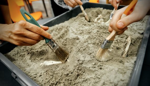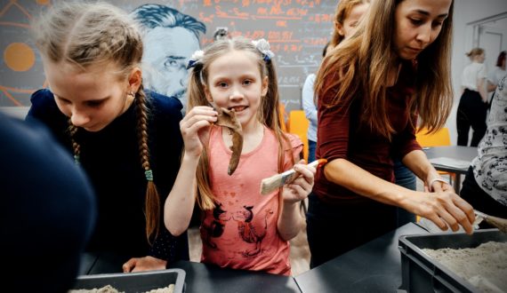 После лекции слушатели примерили на себя роль палеонтологов и откопали в специально устроенных в помещении ИЦАЭ импровизированных раскопгах кости. Как догадались некоторые юные участники, они обнаружили скелет древней собаки. Эти кости сохранились с XV века.