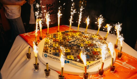 Всех участников мероприятия ждал праздничный торт. «С днём рождения, «Росатом»! — с этими словами гости вечера задули свечки и поздравили ГК «Росатом» с совершеннолетием. Восемнадцатилетний рубеж символизирует переход от накопленного опыта к реализации масштабных планов. Для Госкорпорации «Росатом» этот этап знаменует готовность определять будущее высоких технологий, продолжая традиции атомной промышленности России, отмечающей в этом году 80-летие.
