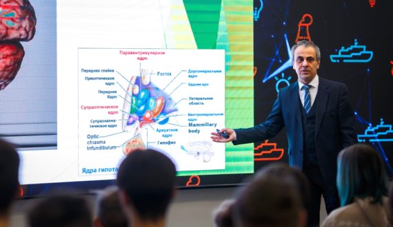О структуре и методах визуализации головного мозга рассказал Арам Аветисов, канд. мед. наук, доцент, заведующий кафедрой радиационной медицины и экологии Белорусского государственного медицинского университета. «МРТ – один из методов визуализации головного мозга. Он основан на эффекте ядерного магнитного резонанса. Ядра атомов водорода под влиянием сильного магнитного поля и резонансной частоты излучения синхронизируют свой спин и генерируют измеряемый сигнал. В тканях с различной плотностью атомов водорода сигнал будет отличаться. Аппарат МРТ фиксирует эти сигналы и преобразует их в изображение. На полученном изображении чётко видны нормальные структуры мозга, а также патологические образования», — подчеркнул спикер.