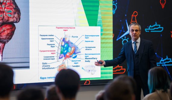 О структуре и методах визуализации головного мозга рассказал Арам Аветисов, канд. мед. наук, доцент, заведующий кафедрой радиационной медицины и экологии Белорусского государственного медицинского университета. «МРТ – один из методов визуализации головного мозга. Он основан на эффекте ядерного магнитного резонанса. Ядра атомов водорода под влиянием сильного магнитного поля и резонансной частоты излучения синхронизируют свой спин и генерируют измеряемый сигнал. В тканях с различной плотностью атомов водорода сигнал будет отличаться. Аппарат МРТ фиксирует эти сигналы и преобразует их в изображение. На полученном изображении чётко видны нормальные структуры мозга, а также патологические образования», — подчеркнул спикер.