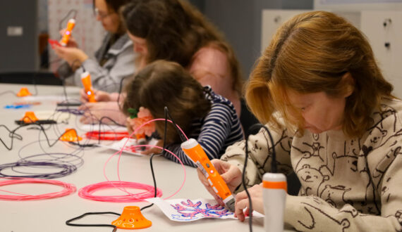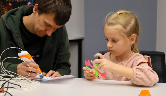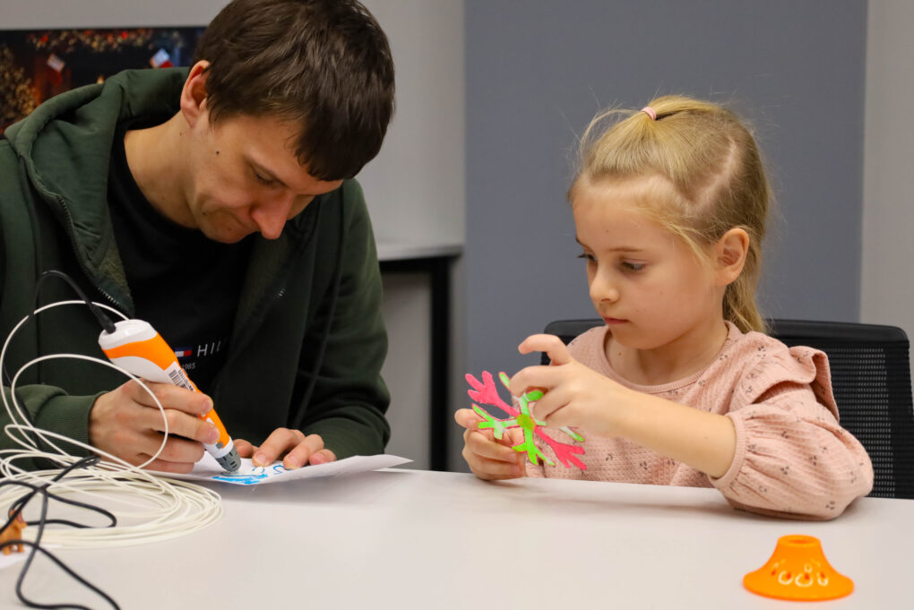 Вечер начался с мастер-класса «3D-снежинка». Участники смогли приобщиться к современным технологиям трехмерного моделирования, освоить основы работы с 3D-ручкой и изготовить оригинальное новогоднее украшение – объёмную снежинку.