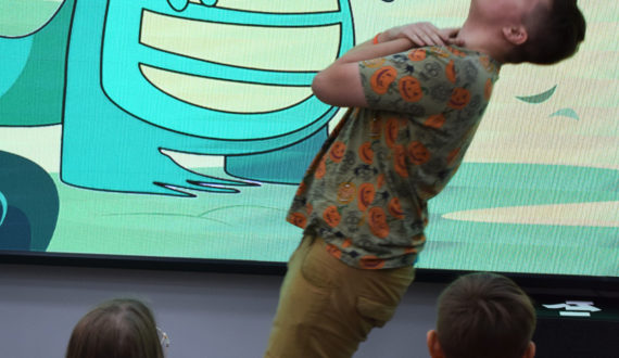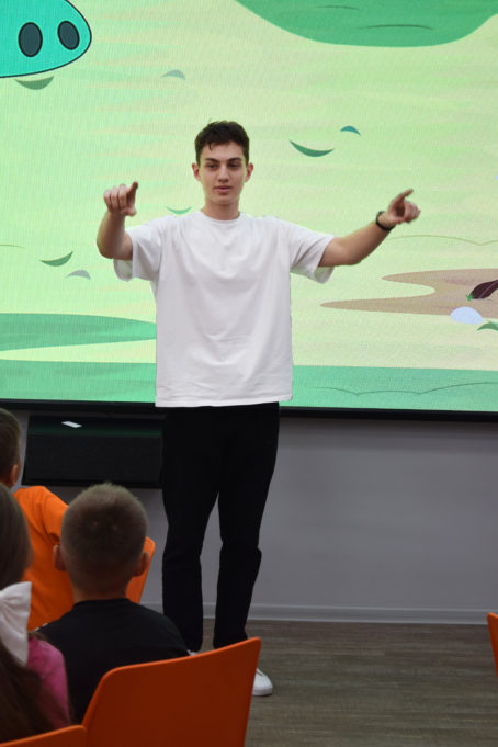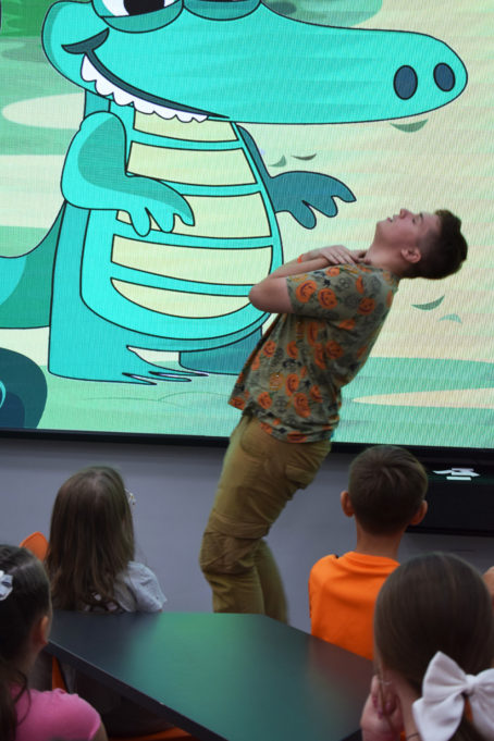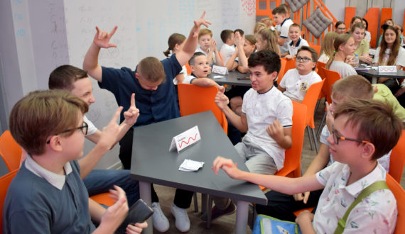 После «Адреналина» ребята сыграли в «Научный крокодил». Как показать жестами лампочку, биссектрису или бактерию? Гости центра демонстрировали блестящие актёрские способности, а команды эмоционально отгадывали слова, относящиеся к науке, показанные при помощи мимики и жестов.