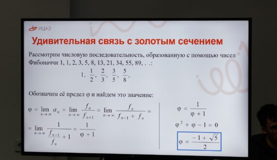 Также зрители узнали о числе Фибоначчи. Они так названы в честь одного из самых знаменитых математиков средних веков был Леонардо из Пизы. «Рассмотрим числовую последовательность, образованную с помощью чисел Фибоначчи 1, 1, 2, 3, 5, 8, 13, 21, 34, 55, 89, … Оказывается, если составить из данных чисел дроби – отношения предыдущего числа к последующему, то если обозначить предел j, то получим что результат стремиться к числу золотого сечения», — подчеркнула Вера Варанкина.