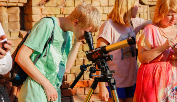Затем участники наблюдали Солнце через телескоп. У астрономов существует шутка, что посмотреть на солнце можно два раза в жизни: правым и левым глазом. Спикеры Никита Капитанов и Николай Лапин развеяли этот миф, объяснив, как увидеть Солнце через телескоп и сохранить при этом зрение. «Существуют специальные фильтры, через которые смотреть на Солнце совершенно безопасно, а вот без них заглядывать в телескоп не советуем», — прокомментировали эксперты.