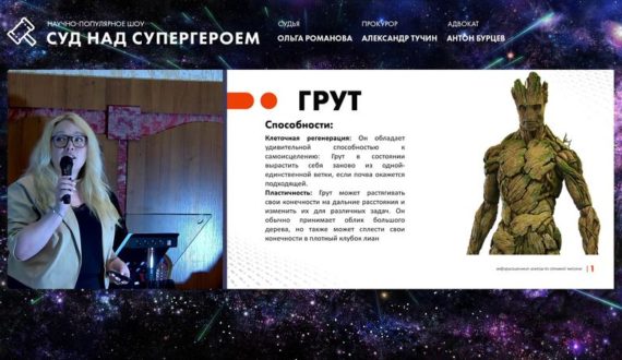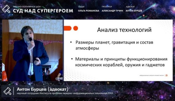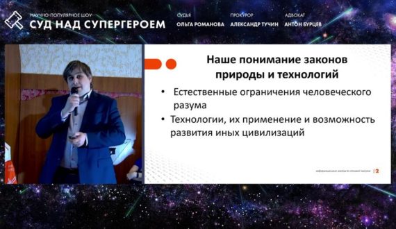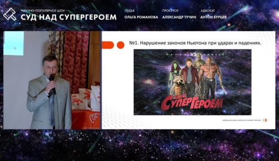 Первым в зале суда выступил прокурор, роль которого исполнил Александр Тучин, преподаватель физики высшей квалификационной категории, почётный работник воспитания и просвещения Российской Федерации, дважды лауреат премии «Лучшие учителя России» Владимирской области. Он объяснил, какие физические законы нарушили супергерои.