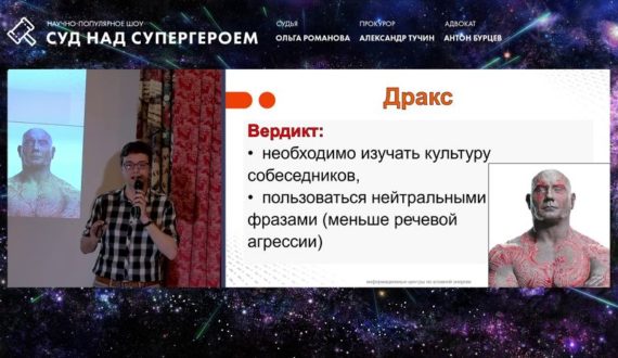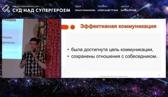 Затем выступили свидетели. Лингвистические особенности членов команды Стражей Галактики разобрал Егор Константинов, филолог, аспирант кафедры русского языка Педагогического института ВлГУ. Он отметил, что эффективной коммуникацию можно признать, если была достигнута её цель и при этом не возникло агрессии.