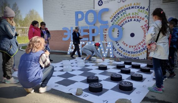 Во дворе у входа в Информационный центр Кольской атомной электростанции уютно расположилась палатка ИЦАЭ Мурманска. В ней всех гостей ждали уличные активности: атомные шашки, игры «Чепухатом» и «Хронограф», объёмный деревянный пазл и тематическая фотозона от КАЭС. Самой популярной активностью стали атомные скакалки, с помощью которых ребята считали, сколько энергии они могут выработать самостоятельно.