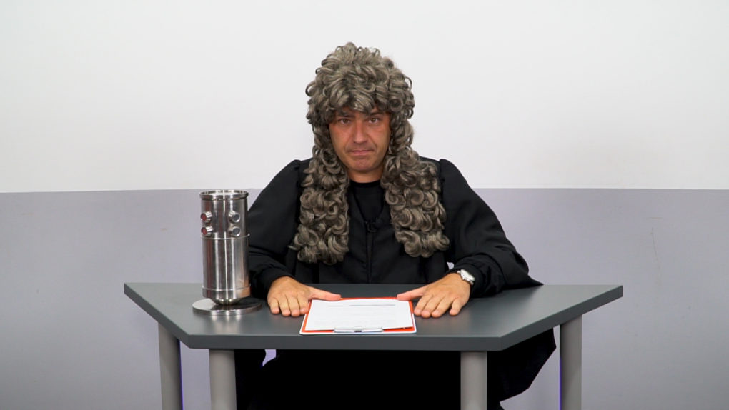 Первым в зале суда выступил прокурор, роль которого исполнил Станислав Кубрин, кандидат физико-математических наук, ведущий научный сотрудник НИИ физики Южного федерального университета (ЮФУ).