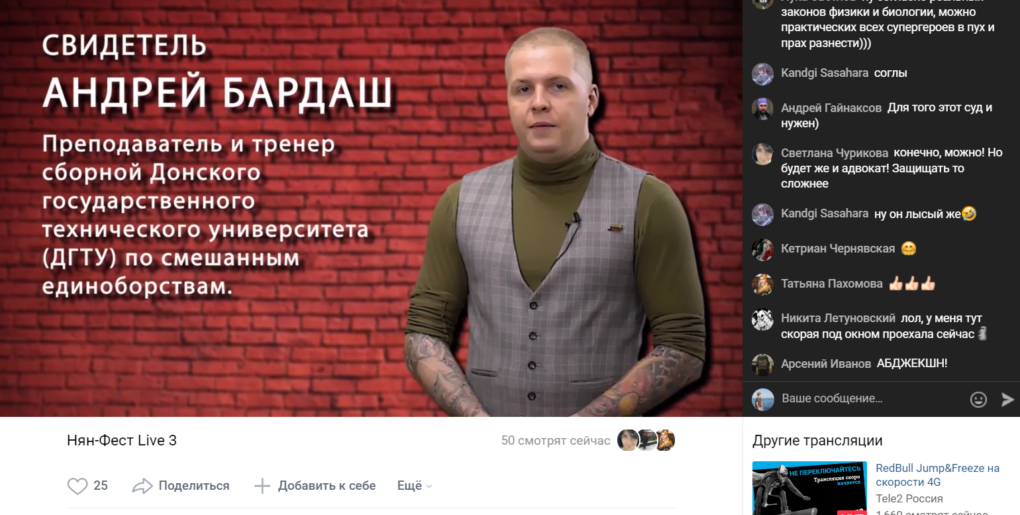 Ток-шоу «Суд над супергероем» можно увидеть в рамках трансляции второго дня фестиваля Нян-Фест по ссылке: https://vk.com/video-10188014_456239256