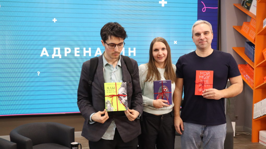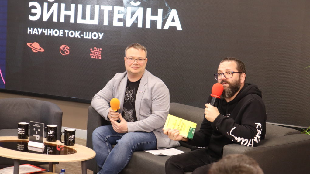 Затем на «Языке Эйнштейна» трое учёных обсудили последние новости науки. Открытия в области космонавтики комментировал Михаил Котов, научный и военный журналист, автор изданий «TechInsider», популяризатор космонавтики, директор по развитию Летней космической школы. Михаил рассказал о роботе-гуманоиде из Индии, открытии новой нетипичной карликовой галактики и рекорде пребывания в космосе.