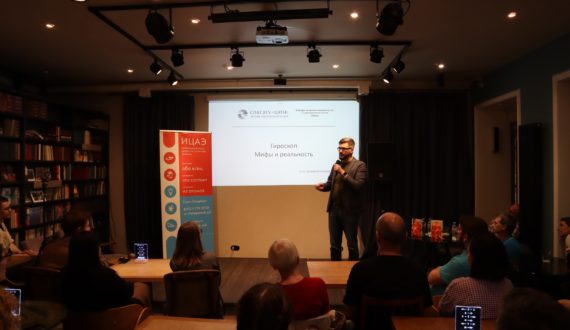 Вторым выступил Александр Кукаев, кандидат технических наук, доцент кафедры лазерных измерительных и навигационных систем в ЛЭТИ. Александр рассказал, что такое гироскопы и какие они бывают, а также объяснил, зачем гироскоп нужен в телефоне, в самолете, в бункере.