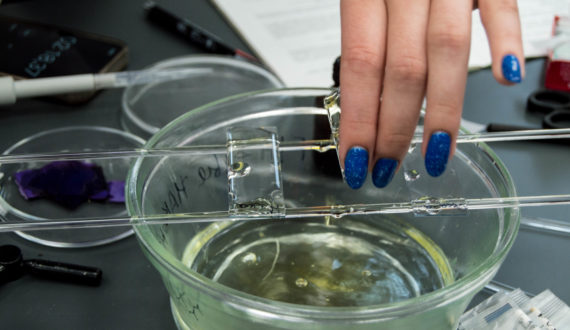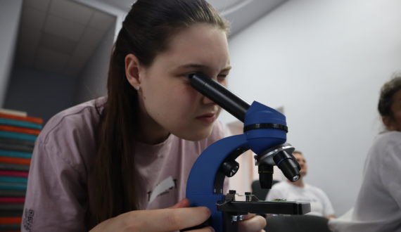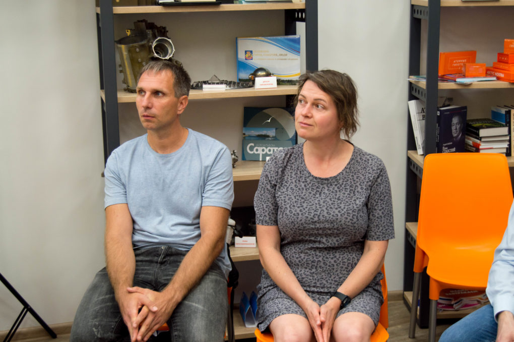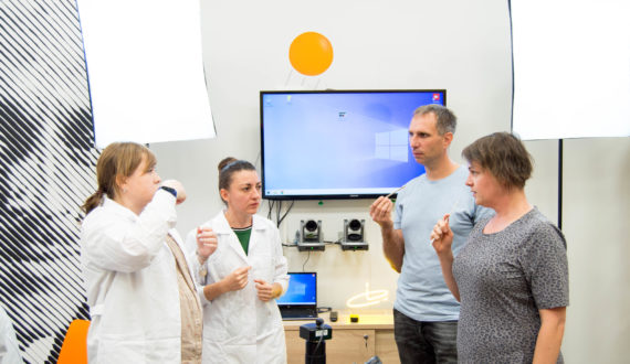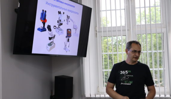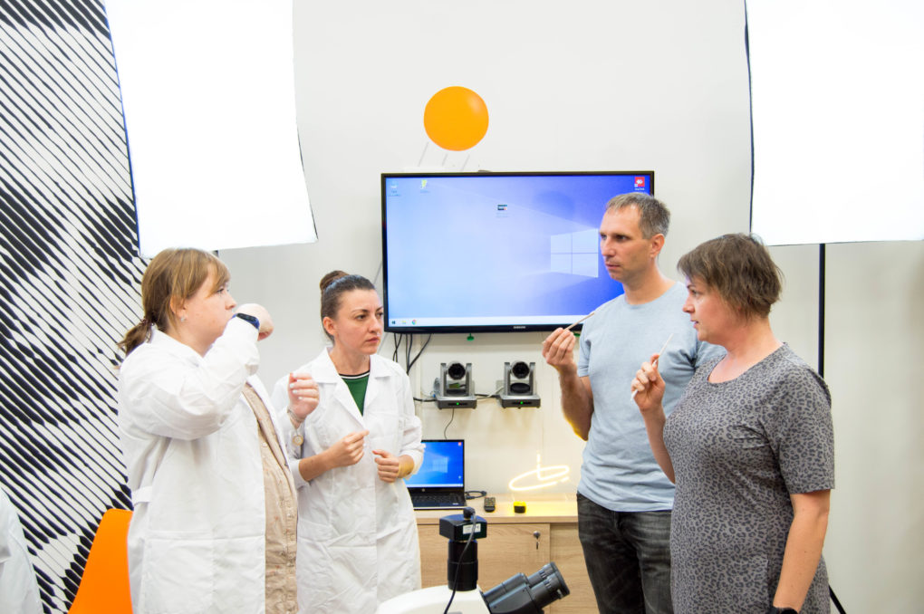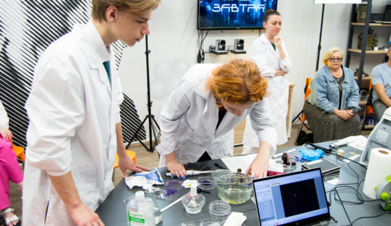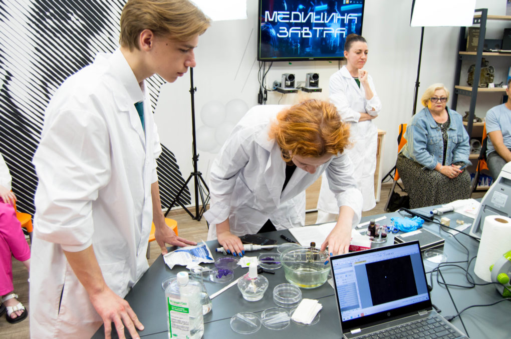 Телемост в саратовском центре предварял мастер-класс «Микроскопы», который подготовили и провели биолог, доцент кафедры генетики, к.б.н. СГУ им. Н.Г. Чернышевского Эльмира Кайбелева и её ассистенты – выпускники Саратовского лицея, призёры Всероссийской олимпиады школьников по биологии Ульяна Москвина и Евгений Курчатов. ИЦАЭ на час превратился в настоящую лабораторию, где были проведены исследования клеток эпителия. Кстати, образцы были взяты у добровольцев – участников мастер-класса. Посетители познакомились с работой лаборанта, увидели работу цифрового микроскопа, добрались до ядра клетки, смогли рассмотреть вредные для человека бактерии.