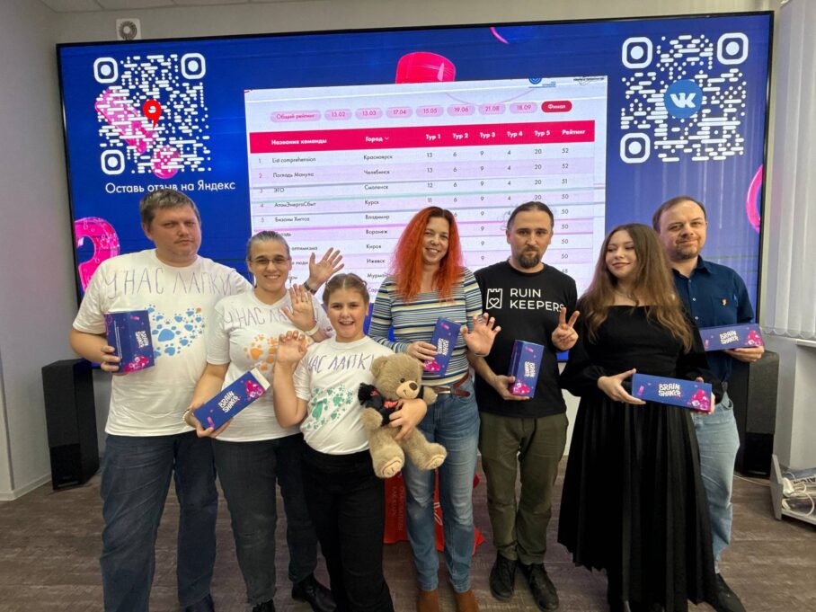 Турнир 2025 года для победителей – стартовый. Они лишь в этом сезоне присоединились к игре и сразу смогли показать впечатляющий результат. Участница команды «List comprehension» Наталья Кибизова поделилась своими впечатлениями: «Мы так волновались, не на все вопросы смогли ответить, будто всё из головы вылетело. Особенно хотелось бы выделить вопросы про маятник Фуко и Исаакиевский собор, а по форме интересный вопрос был про термитов и УАЗ. Спасибо авторам, спасибо за игру, было здорово!»