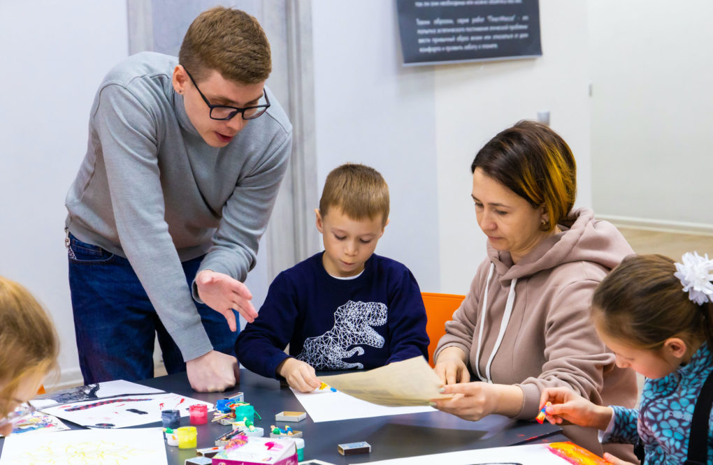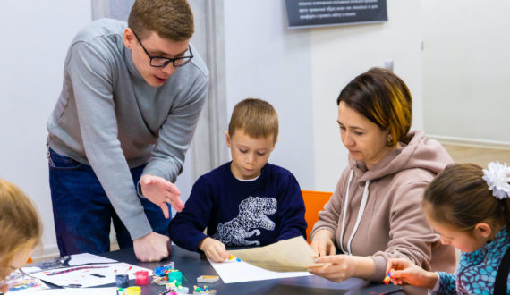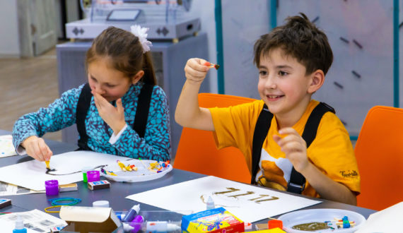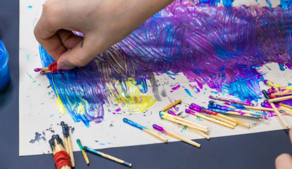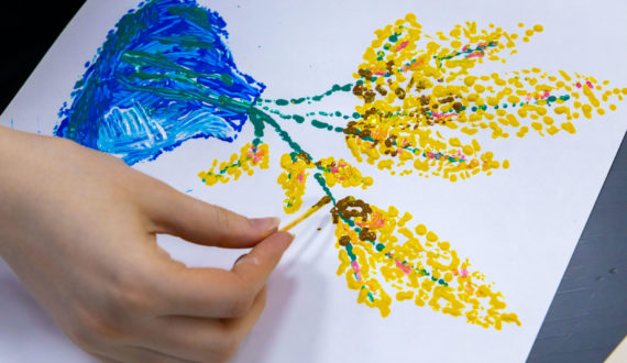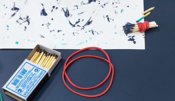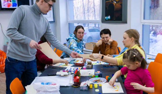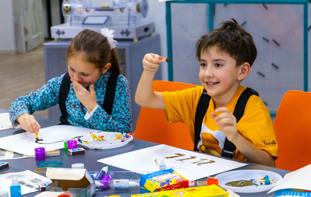 С помощью спичек-кисточек, используя специальную точечную технику «пуантилизм», участники мероприятия под руководством Антона создавали уникальные рисунки в стиле примитивизма Марка Шагала.