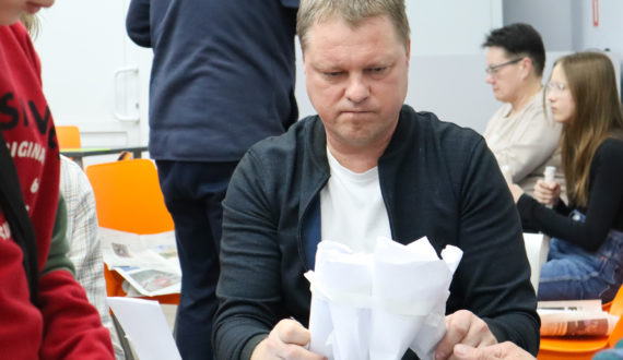 Завершился вечер мастер-классом «Бумажный сопромат для чайников». Гости центра попробовали себя в роли инженеров и проверили свои знания теории сопротивления материалов, соорудив настоящие стулья из бумаги и скотча. И хотя ни одно из сооружений не прошло проверку на прочность, участники приобрели полезный конструкторский опыт и хорошо повеселились, испытывая стулья.