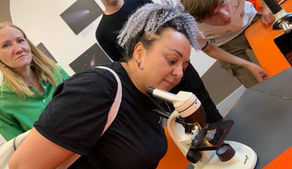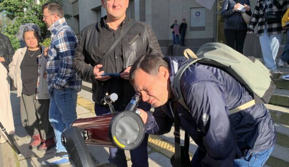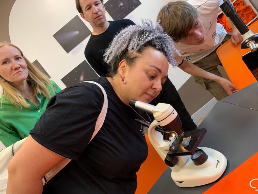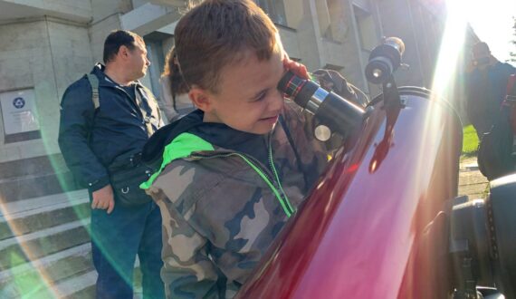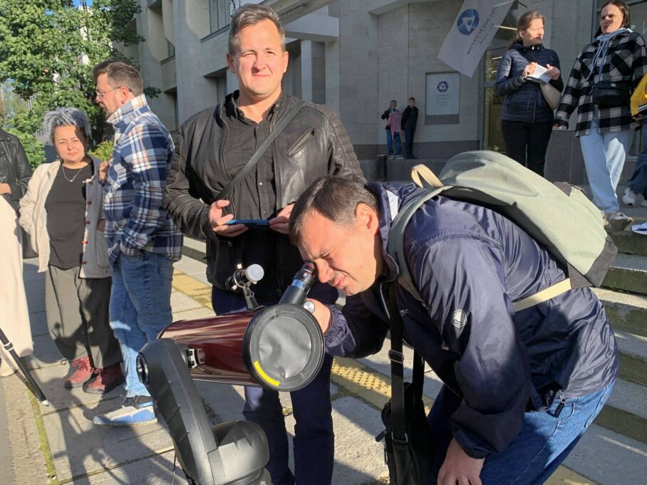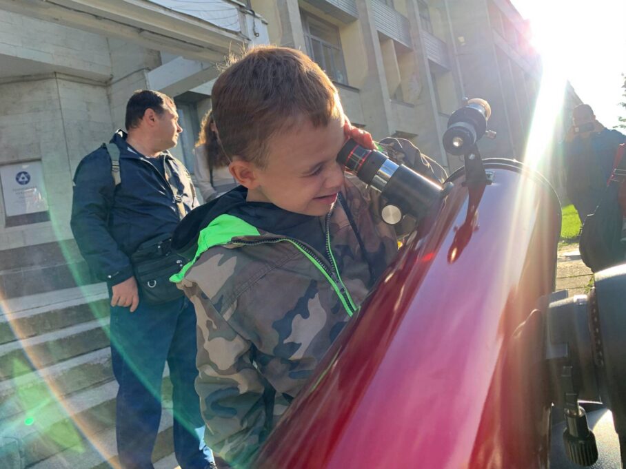 Вечер начался с наблюдения в телескопы. Благодаря специальным фильтрам и настройкам, гости смогли не просто посмотреть на Солнце, но и увидеть на нём пятна – тёмные области, температура которых понижена. После наблюдения участники мероприятия поднялись в ИЦАЭ, где их ожидала экскурсия по экспозиции «Атомная энергия», во время которой они узнали о работе атомных электростанций, уникальной ПАТЭС и единственном в мире атомном ледокольном флоте.