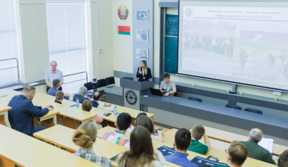 Сотрудники Информационного центра по атомной энергии (ИЦАЭ) Минска 19 апреля приняли участие в проведении «Дня атомных профессий». Мероприятие прошло совместно с «Росатом» и Белорусским государственным университетом. На физическом факультете вуза собралось более 100 студентов физического и химического факультетов БГУ, МГЭИ им. А.Д. Сахарова и старшеклассников столицы.