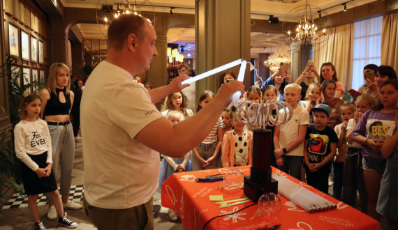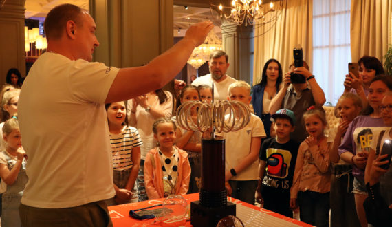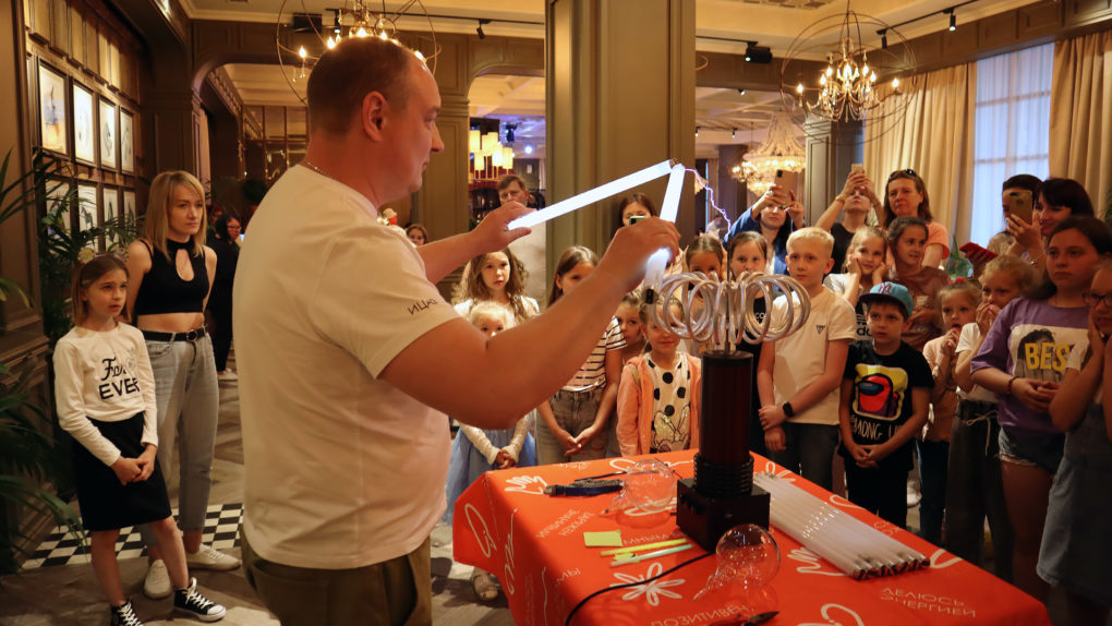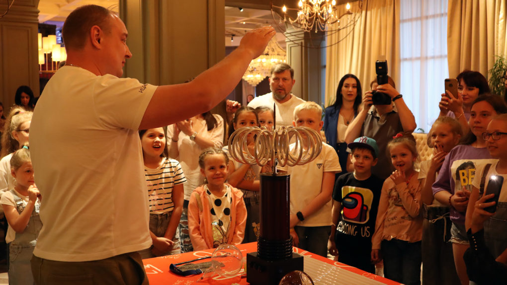 Юные участники на занятии “Занимательная наука”, которое провёл сотрудник ИЦАЭ Саратова Иван Мартынов, познакомились с электричеством. “Человек тоже может быть проводником тока. Но наш организм состоит из множества веществ. Какое же является проводником? Человек состоит из воды на 70-80%. Делаем вывод, что это вода”, – рассказал Иван Мартынов и провёл несколько экспериментов с заряженными частицами. Также посетители узнали, что такое статическое электричество, как образуется молния, и стали зрителями яркого “Тесла-шоу”, где Иван продемонстрировал воздействие установки Тесла на тело человека.