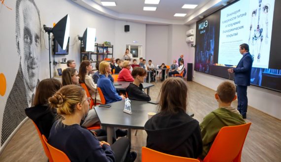 В конце дня для гостей ИЦАЭ Саратова прошла лекция «Титан – «философский камень» в медицине» от доктора технических наук Александра Фомина. Заведующий кафедрой «Материаловедение и биомедицинская инженерия» СГТУ имени Гагарина Ю.А., член Российского Национального комитета по теоретической и прикладной механике (при РАН), действительный член Академии электротехнических наук Российской Федерации рассказал о том, как делают титановые имплантаты: «Структуру имплантата подбирают под конкретную ткань, к которой он устанавливается. Не химический состав должен обеспечивать взаимодействие имплантата с тканью, а структура и наличие биосовместимого компонента. Имплантат должен выдержать нагрузку и стимулировать за счёт своей геометрии обрастание костной тканью».