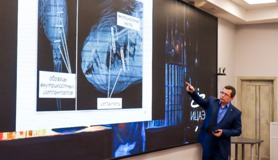 В конце дня для гостей ИЦАЭ Саратова прошла лекция «Титан – «философский камень» в медицине» от доктора технических наук Александра Фомина. Заведующий кафедрой «Материаловедение и биомедицинская инженерия» СГТУ имени Гагарина Ю.А., член Российского Национального комитета по теоретической и прикладной механике (при РАН), действительный член Академии электротехнических наук Российской Федерации рассказал о том, как делают титановые имплантаты: «Структуру имплантата подбирают под конкретную ткань, к которой он устанавливается. Не химический состав должен обеспечивать взаимодействие имплантата с тканью, а структура и наличие биосовместимого компонента. Имплантат должен выдержать нагрузку и стимулировать за счёт своей геометрии обрастание костной тканью».