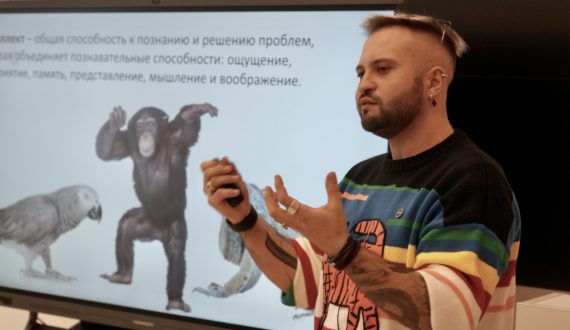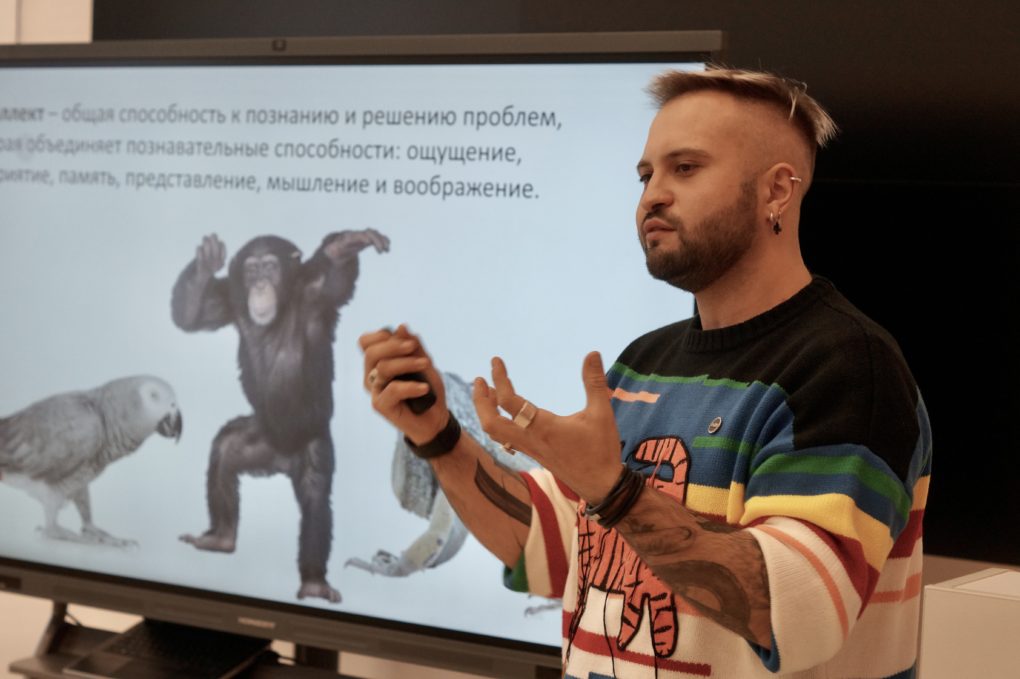 Открыла «Энергию науки» 4 декабря лекцию на тему: «Сны для осьминога. Интеллект животных» в образовательном центре «Содружество». Илья Гомыранов рассказывал ученикам старших классов о том, способны ли животные читать, решать простые арифметические задачи и узнавать себя в зеркале, а также о том, как учёные изучают интеллектуальные способности животных и можно ли научить говорить обезьяну и есть ли культурные традиции у китов.