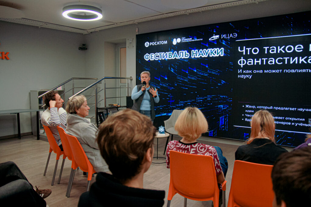 Особый интерес вызвала дискуссия «Наука, вдохновляющая фантастику», которую прочла Вероника Суворова, руководитель PR-направления издательства МИФ. Гости ИЦАЭ активно обсуждали, как научные открытия находят свое воплощение в художественных произведениях, и, напротив, как фантастика предвосхищает реальные технологии. «Научная фантастика — это мощный инструмент, который предлагает научно обоснованные идеи, предсказывает открытия и вдохновляет инженеров и учёных на новые свершения. Она задает вектор для научного поиска», — пояснила спикер.