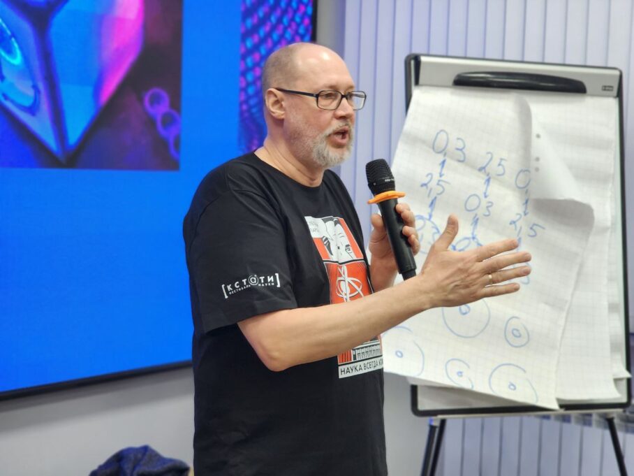 27 марта Сергей Цысс рассказывал гостям ИЦАЭ о том, как устроена квантовая механика, что такое неопределенность Гейзенберга и как работают сканирующий микроскоп и кубиты. Слушатели смогли принять участие в эксперименте, иллюстрирующем явление квантовой запутанности.