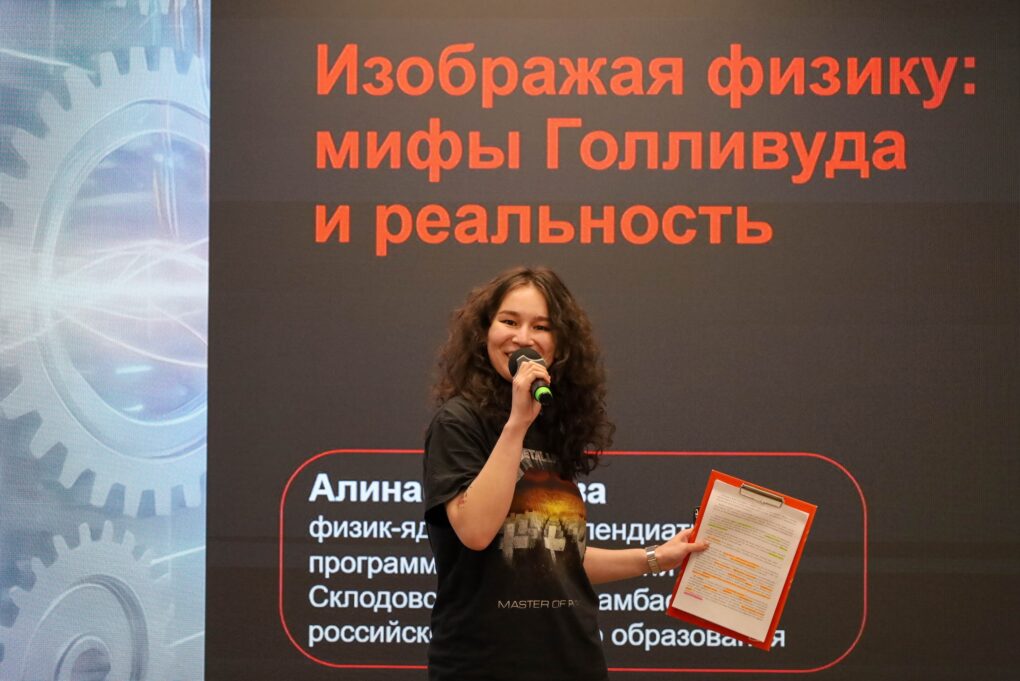 Разговор про красоту технологий и научных явлений продолжила Алина Бегимова — физик-ядерщик, стипендиатка программы МАГАТЭ имени Марии Склодовской-Кюри, член редакции «Атомной энергии 2.0» и амбассадор российского ядерного образования. В своей лекции «Дизайн по ГОСТу или почему физика круче Голливуда» она рассказала, что визуальная магия эффекта Вавилова-Черенкова заключается в нарушении интуитивного правила: «ничто не может двигаться быстрее света». Это правило работает для вакуума, но в прозрачных средах, воде или стекле, свет замедляется. Когда заряженная частица, например, электрон, влетает в воду со скоростью, превышающей скорость света в этой конкретной среде, происходит физический парадокс. Частица «обгоняет» собственное электромагнитное поле. Это прямой аналог звукового удара, который мы слышим, когда сверхзвуковой самолет преодолевает звуковой барьер. Только в случае с частицей «удар» происходит не в виде звука, а в виде вспышки света. Излучение при этом распространяется не во все стороны, а строго по направлению движения частицы, образуя идеальный светящийся конус.