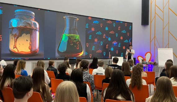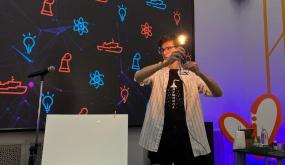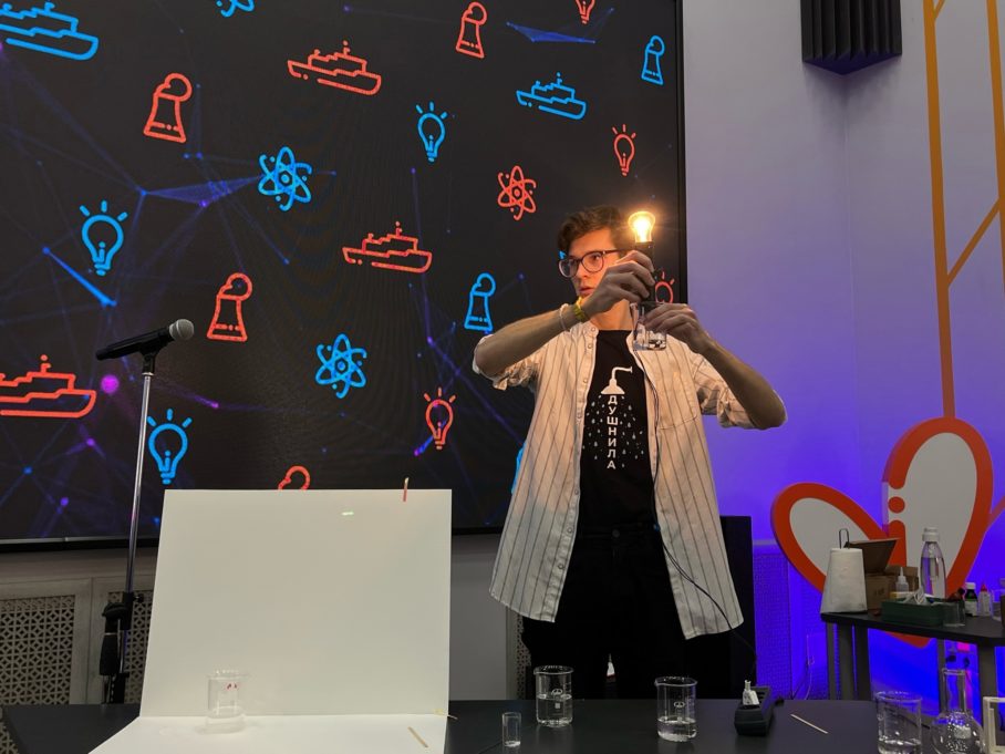 В ходе лекции эксперт провёл несколько опытов, которые демонстрируют химические свойства кислот. Участники получили твёрдую кремниевую кислоту и угольную кислоту, а также посмотрели на то, как связаны диссоциация и электропроводность, и с помощью кислот смогли зажечь лампочку.