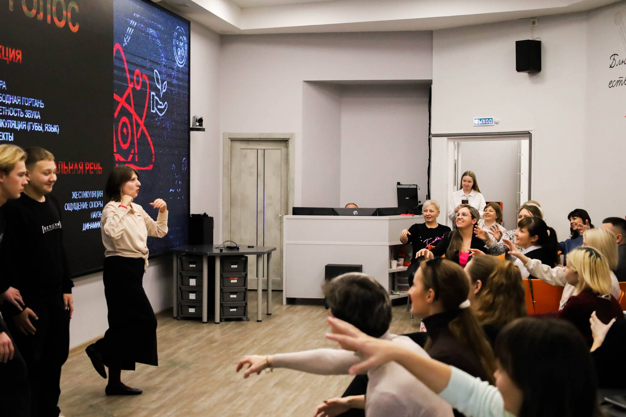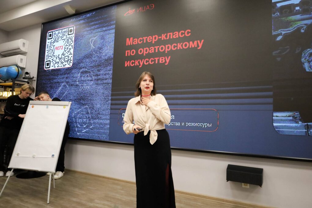 Затем педагоги приняли участие в мастер-классе по ораторскому искусству от Василисы Одоевской, художественного руководителя театра «Обратная Перспектива», преподавателя кафедры теории, истории и педагогики искусства факультета искусств педагогичного института СГУ имени Н.Г. Чернышевского. Василиса рассмотрела основные аспекты успешного выступления: дикцию, уверенность, эмоциональную речь, импровизацию и харизму. Спикер подробно разобрала возможности голоса и показала упражнения для создания красивого, полётного, сильного голоса, который может звучать много часов и не уставать.