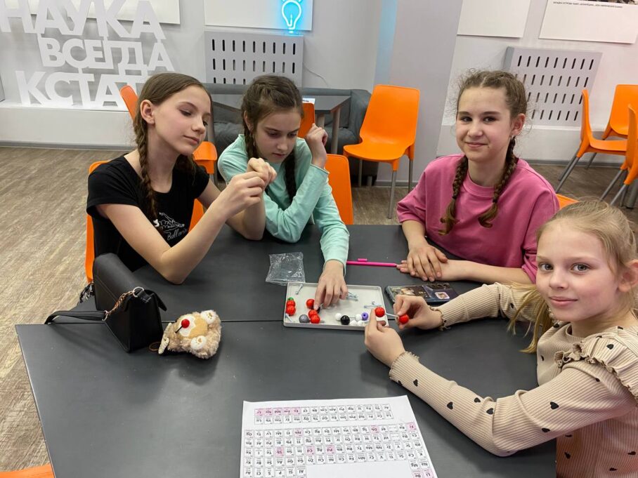 На практикуме «Из чего всё сделано?» младшие школьники смогут не только узнать, из чего состоят вещества во Вселенной, изучить строение атома и познакомиться с периодической таблицей Менделеева, но ещё и собрать при помощи специального конструктора несколько молекул, включая мел, поваренную соль и воду.