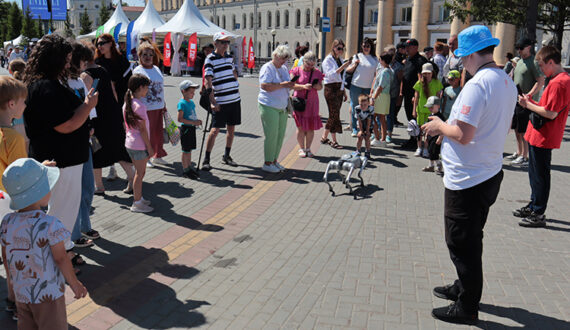 У входа на площадку посетителей ждало необычное зрелище — всех приходящих встречала робособака, привлекавшая внимание и детей, и взрослых. Робот танцевал и приветствовал гостей «Научной лужайки», постоянно находясь в центре внимания и вызывая улыбки и интерес проходящих мимо людей.