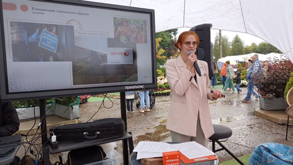 Началась программа с разговора о зелёных офисах. Экс-член Совета юниоров «Росатома», волонтёр ИЦАЭ Кирова, а ныне сотрудник отдела по связям с общественностью Федерального экологического оператора Варвар Жилина прочитала лекцию «Как «зелёные офисы» спасают планету и почему это выгодно для всех?».
