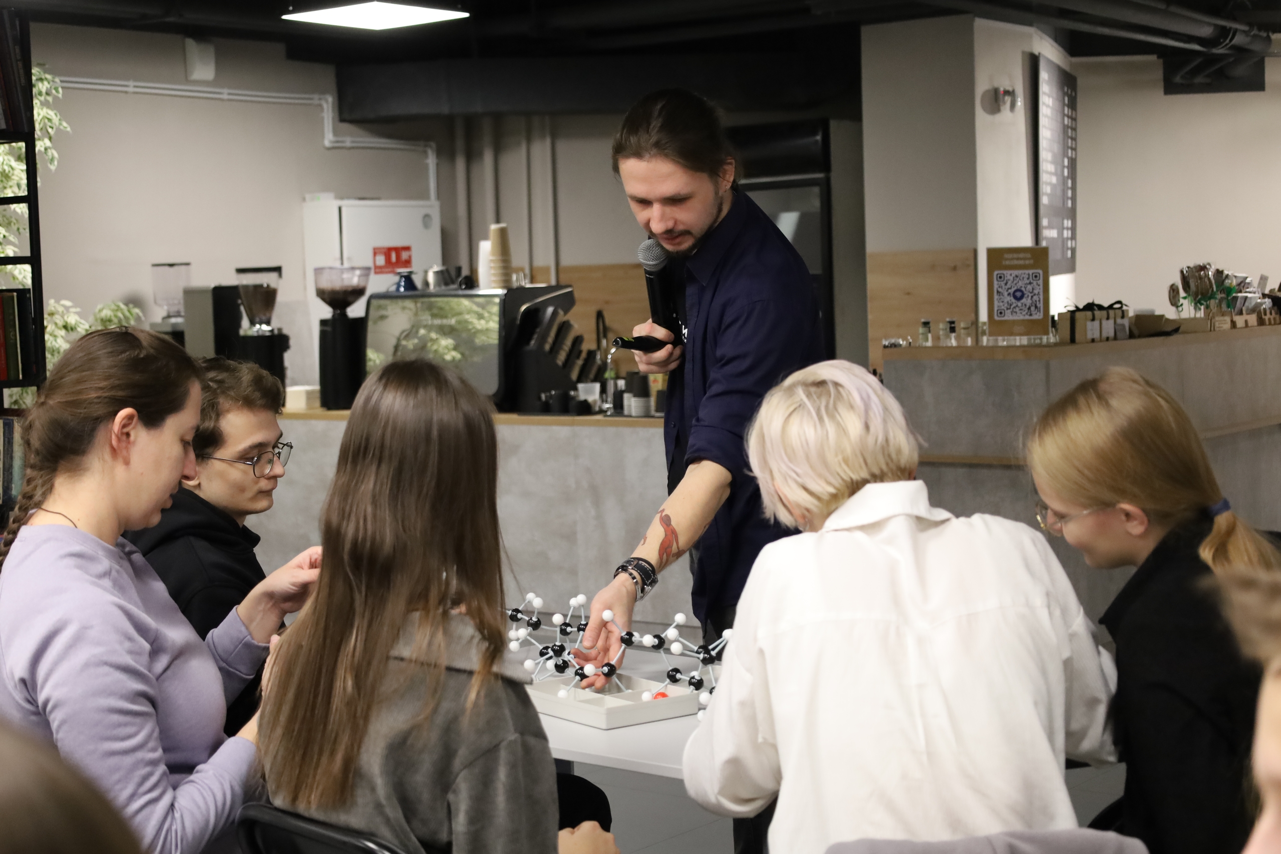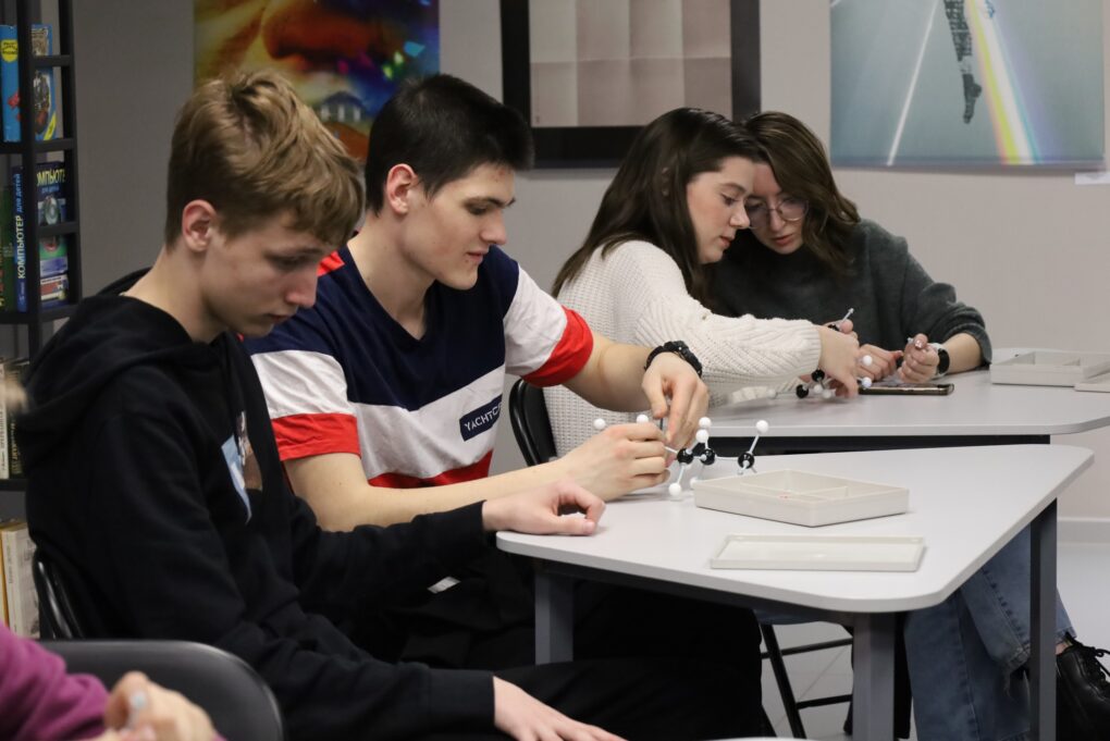 Начался «ИЦАЭ OPEN» с атомного практикума «Мир больших молекул». Участники выяснили, чем на самом деле отличаются внешне похожие соль и сахар, что скрывается за понятиями «органическое» и «неорганическое» вещество, а также узнали о самом длинном белке в организме, полимерах и древнейших композитах. Чтобы закрепить эти знания на практике, гости работали с химическим конструктором, собирая модели молекул, и разгадывали тематический кроссворд.