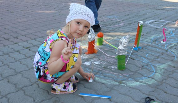 Семейный четверг начался с конкурса рисунков на асфальте «Построй город будущего». Шесть команд создали макеты идеальных городов.